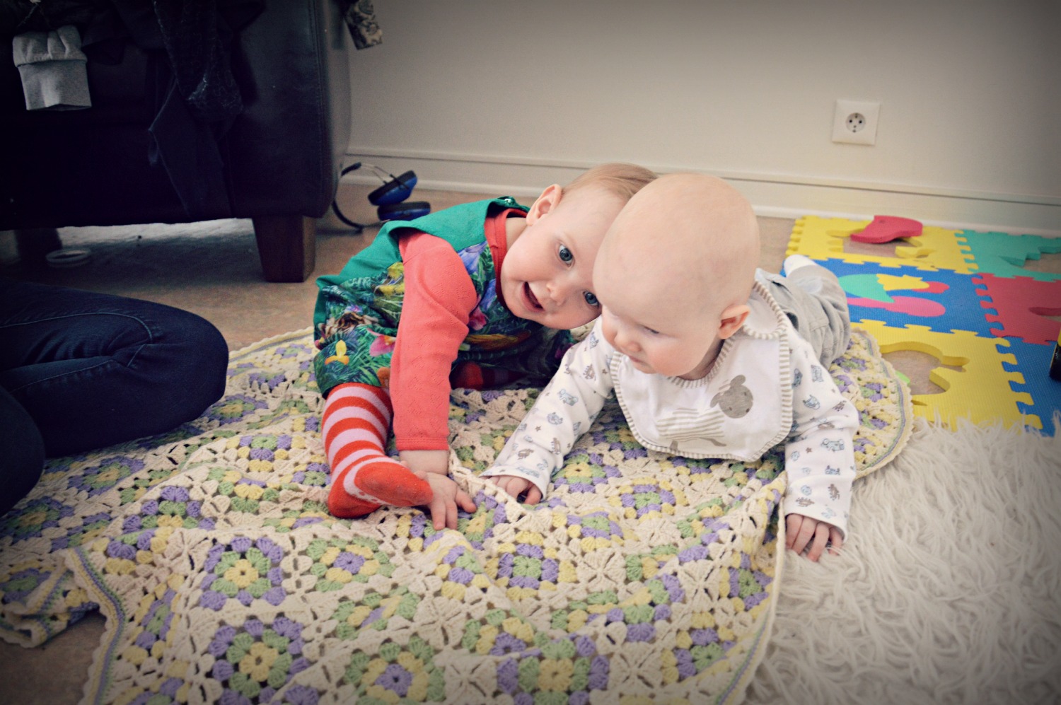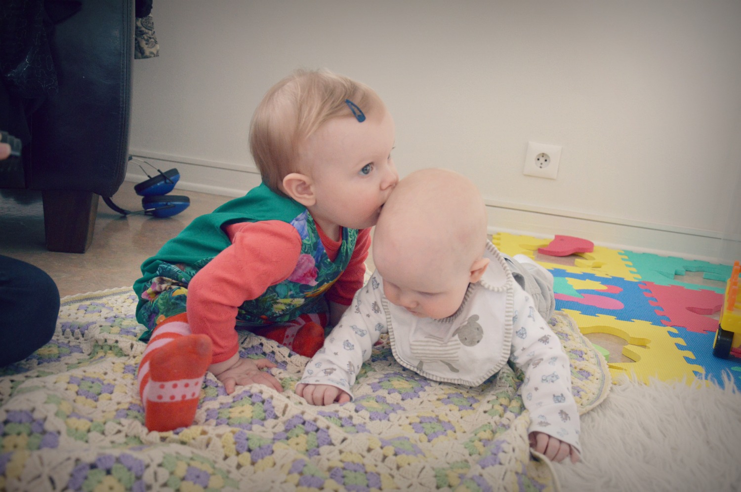 Í dag fengum við langþráða heimsókn. Sara Eik, Hákon Frosti og Snjólfur Atli kíktu á okkur, en við vorum að hitta Snjólf Atla í fyrsta sinn. Sara hitti Kötlu Eldeyju þegar hún var nokkurra daga gömul, en svo höfum við bara ekkert sést í heila óléttu og tæpa 6 mánuði 🙂 Svona geta vegalengdirnar verið langar á litla Íslandi. Katla Eldey er fædd í janúar 2013 og Snjólfur Atli í október, svoleiðis að þau eru jafnaldrar, en bilið er svolítið langt ennþá 🙂 Katla Eldey tók á móti þeim litla með kossum og knúsum. Við hlökkum til að hitta þau meira í sumar 🙂