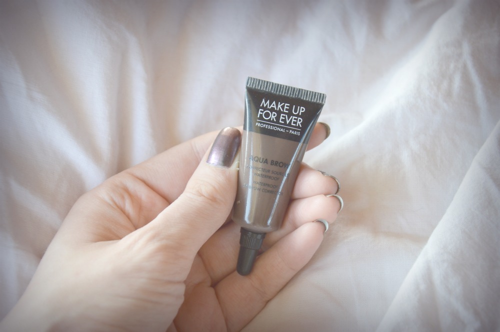 MAKE UP FOR EVER Aqua brow er í þægilegum umbúðum, eða túpu með mjóum stút. Formúlan er gelkennd og fljótandi. Ég set yfirleitt einn dropa á pallettu eða handabakið á mér, dýfi burstanum í og stimpla á tissjú áður en ég ber litinn í brúnirnar. Líkt og með Dipbrow, þá þarf maður að passa magnið. Þar sem formúlan er frekar runny er auðvelt að stimpla óvart á vitlausa staði og þá verður maður að vera fljótur að stroka út með eyrnapinna. Maður þarf að vera aðeins nákvæmari með Aquabrow og hann kemur ekki jafn vel út í húðinni og Dipbrow. Hins vegar kemur hann mjög eðlilega út í hárunum sjálfum. Aqua brow er vatnsheldur líka og hann haggast ekki.