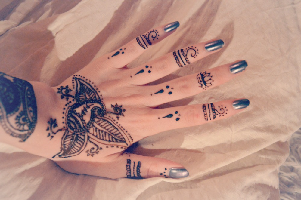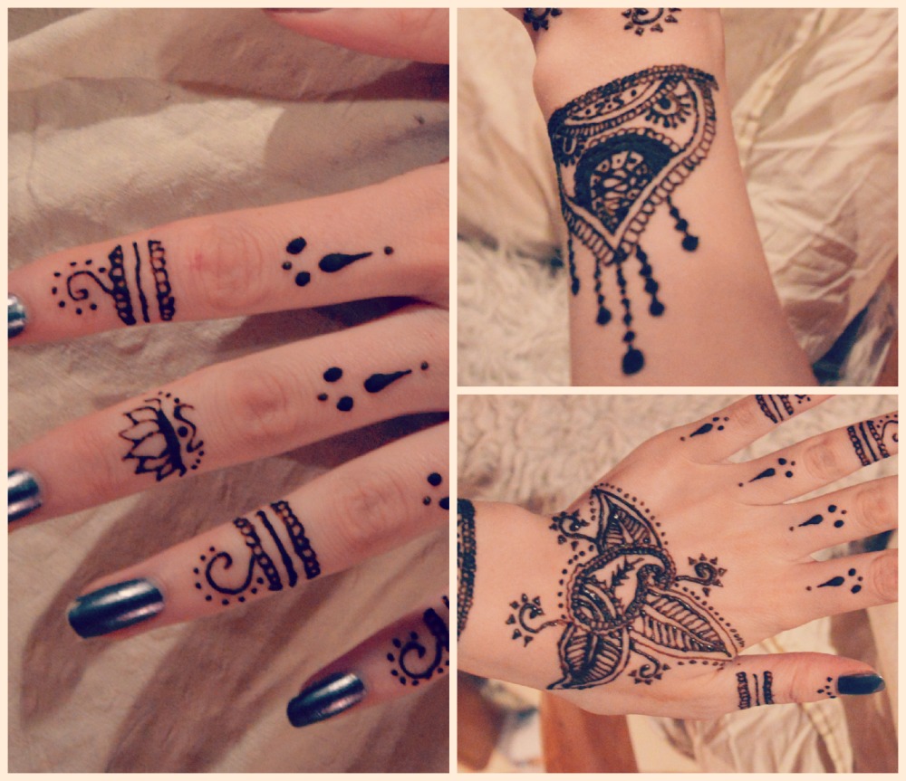 Ég prófaði henna í fyrsta skiptið af einhverri alvöru í gær. Mér finnst mehndi munstur svo ótrúlega falleg og mig langaði að gera heiðarlega tilraun sjálf. Ég hef alltaf haft mjög gaman að svona fríhendis dúllerí-teikningu og þetta á mjög vel við mig. Það tekur smá tíma að ná réttu tækninni, en ég er alveg viss um að ég verð ekki svona skjálfhent næst 🙂 Línurnar eru ekki alveg þær fallegustu og næst ætla ég að reyna að fara eftir einhverju sérstöku munstri. Æfingin skapar víst meistarann!
