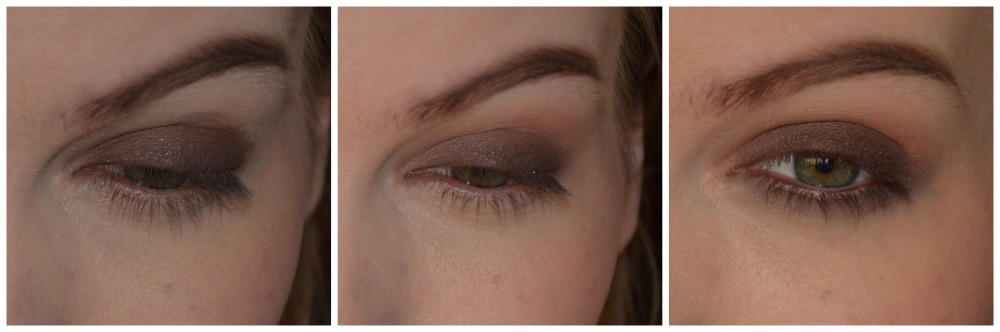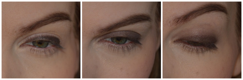 Ég byrja á því að klessa dökkbrúnum augnblýanti á augnlokið. Ég nota stila smudge stick waterproof eyeliner og hann er minn uppáhalds í svona djobb. Næst dreifi ég úr honum með blenderbursta. Á þriðju myndinni er ég síðan búin að setja dekksta (grábrúna) litinn yfir u.þ.b. hálft augnlokið.