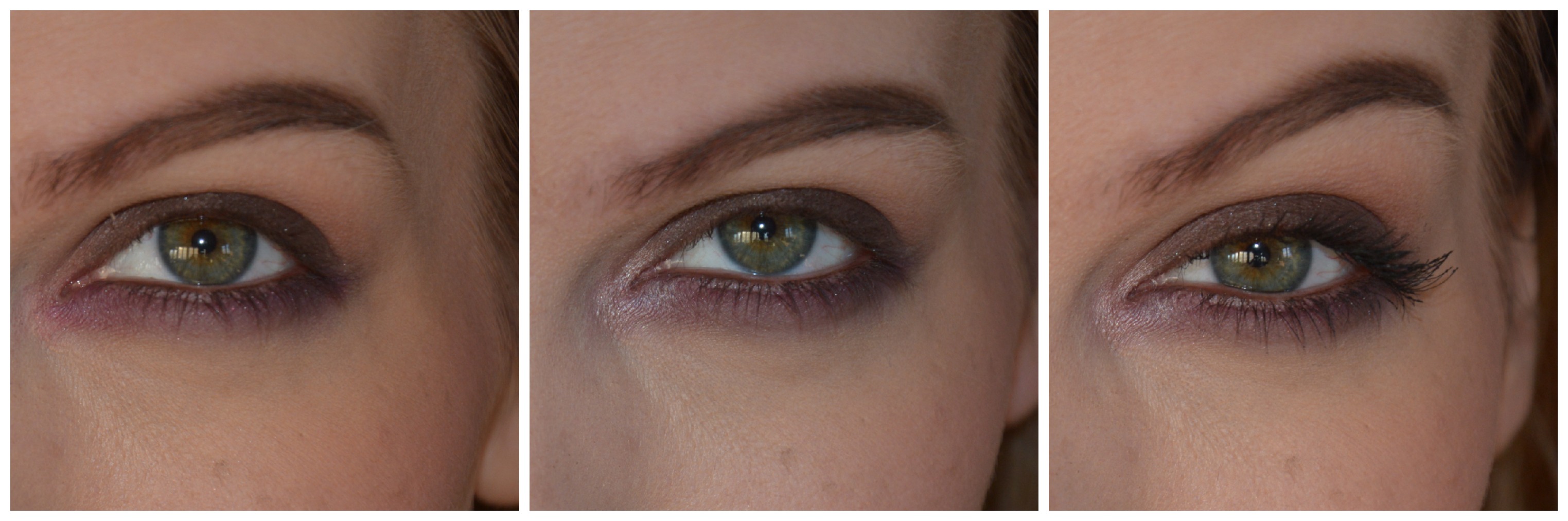 Næst set ég rauðbrúna litinn fyrir ofan hann og blanda þeim saman. Svo mýki ég skilin með því að setja smá af ferskjulitaða augnskugganum í blöndunarbursta, ber hann í glóbuslínuna og upp á augnbeinið. Hvíta litinn nota ég síðan til að blanda hann út. Á myndinni lengst til hægri er ég búin að setja augnblýant í neðri augnlínu og mýkja hann með puttunum. Ég nota hann sem grunn undir fjólubláa litinn.