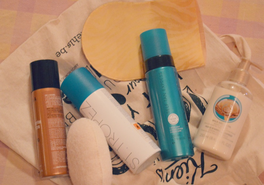 Það er misjafnt hvort ég ber kremið á mig að morgni, um miðjan dag eða að kvöldi. Mér finnst samt best að gera það að morgni, svona klst eftir sturtu. Húðin þarf að vera þurr og svo get ég leyft litnum að koma fram yfir daginn, án þess að hann klessist í rúmfötin. Ég ber kremið/froðuna/spreyið eiginlega alltaf á mig með þar til gerðum hanska, en þeir fást í flestum apótekum (sjá þetta gula, ljóta á efstu myndinni). Með hanskanum fæst jafnari áferð, en ég set brúnkukremið yfirleitt beint á húðina og dreifi svo úr því með hanskanum í hringlaga hreyfingum.