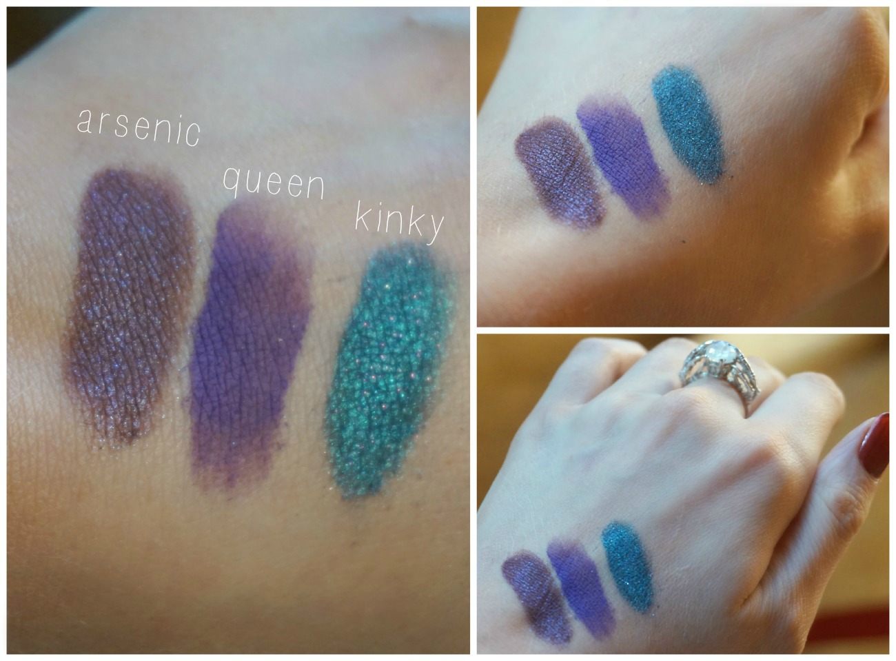 Í boði á Akila.is eru bæði mattir augnskuggar og með sanseringu/glitri, allir í lausu formi. Ég fékk að prófa litina arsenic, queen og kinky.